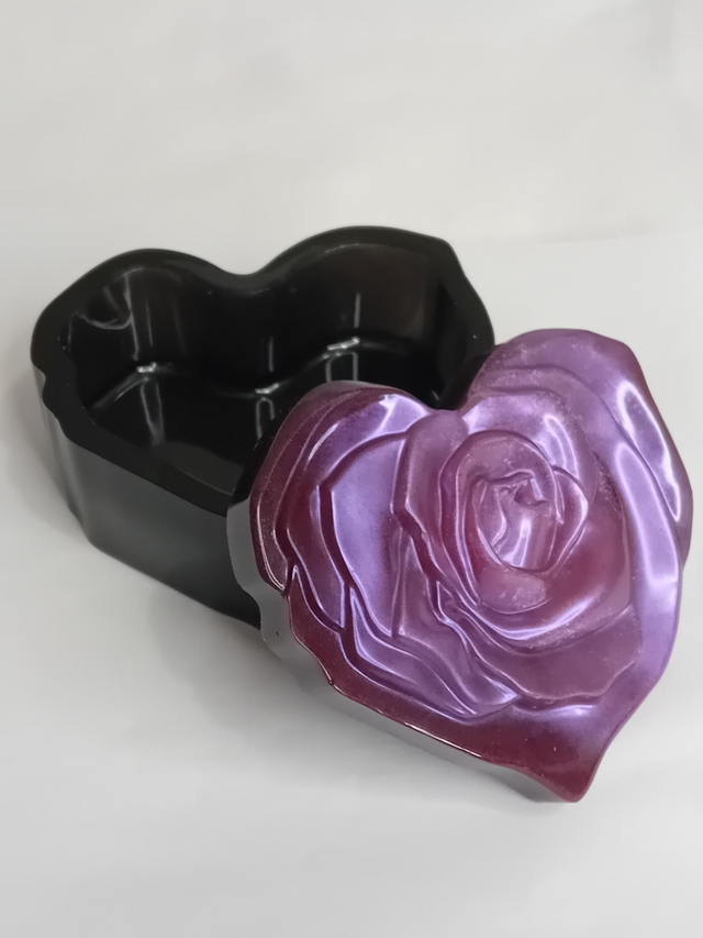 Boite forme cœur noir avec couvercle avec rose ,rose nacré