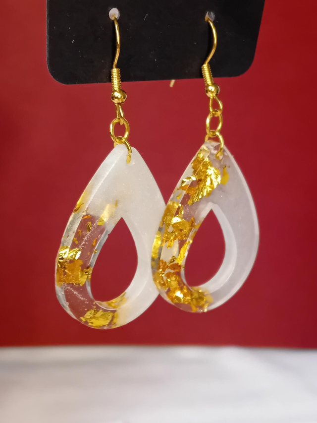 Boucles d'oreilles blanc nacré et transparent avec feuilles pailletés or
