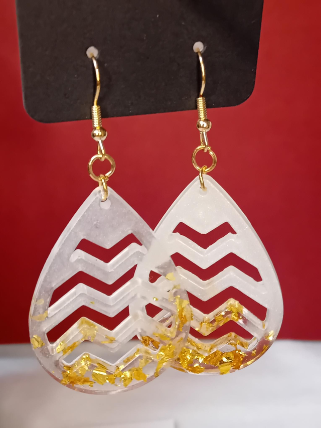Boucles d'oreilles blanc nacré et transparent avec feuilles pailletés or