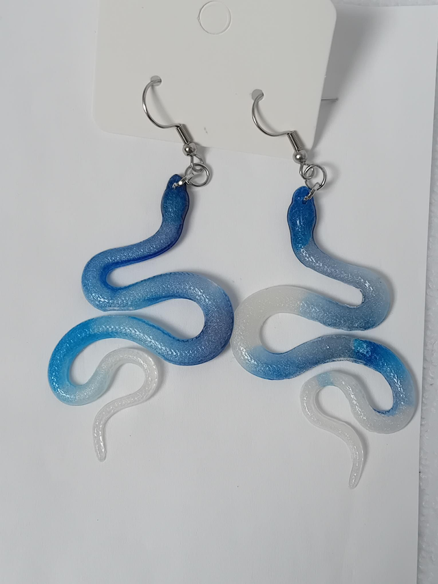 Boucles d oreilles serpent avec effet peau de serpent blanc nacré et bleu électrique
