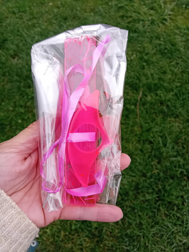 Marque page forme géométrique rose vif transparent et sa bague de lecture au même couleur