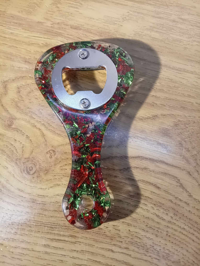 décapsuleur transparent avec feuilles pailletés vert et rouge