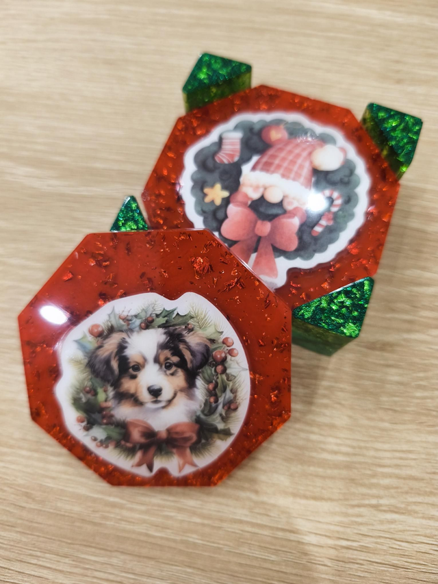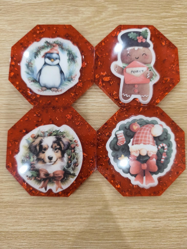 Lot de 4 dessous de verre version noel rouge et socle vert avec dessin de Noël incorporer dedans