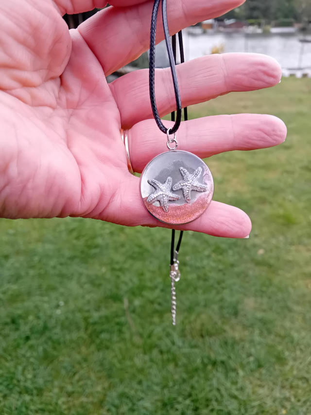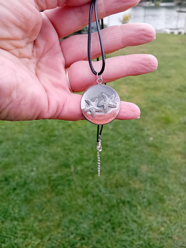 Médaillon étoile de mer sur plage holographique sur chaîne en cuir longueur 40cm