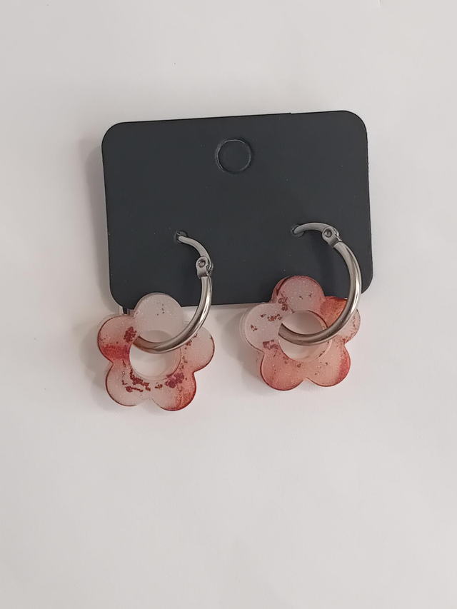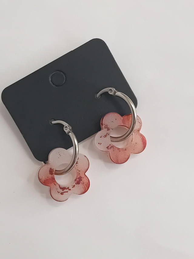 Boucles d oreilles pampille fleur blanc nacré et rouge rose métallisé monté sur créole argent