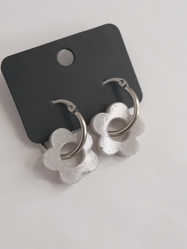 Boucles d oreilles pampille fleur gris métallisé monté sur créole argent
