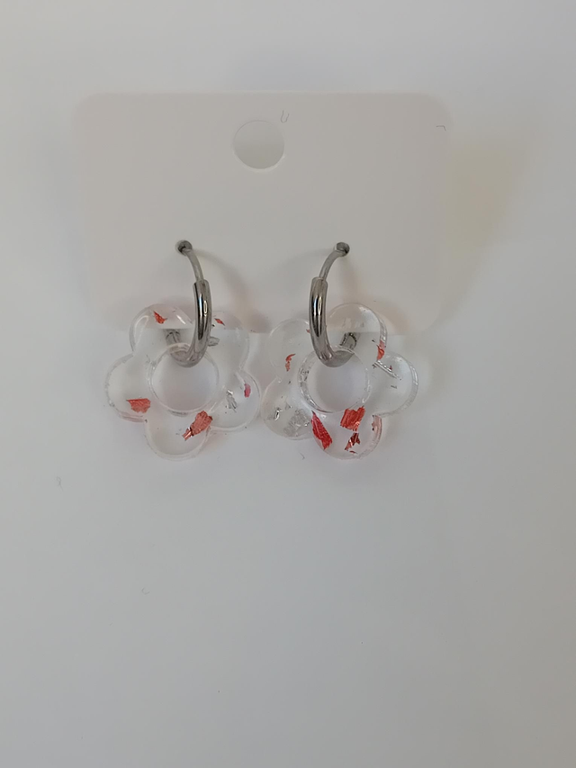 Petite pampille fleur transparente avec feuilles pailletés rose et argent