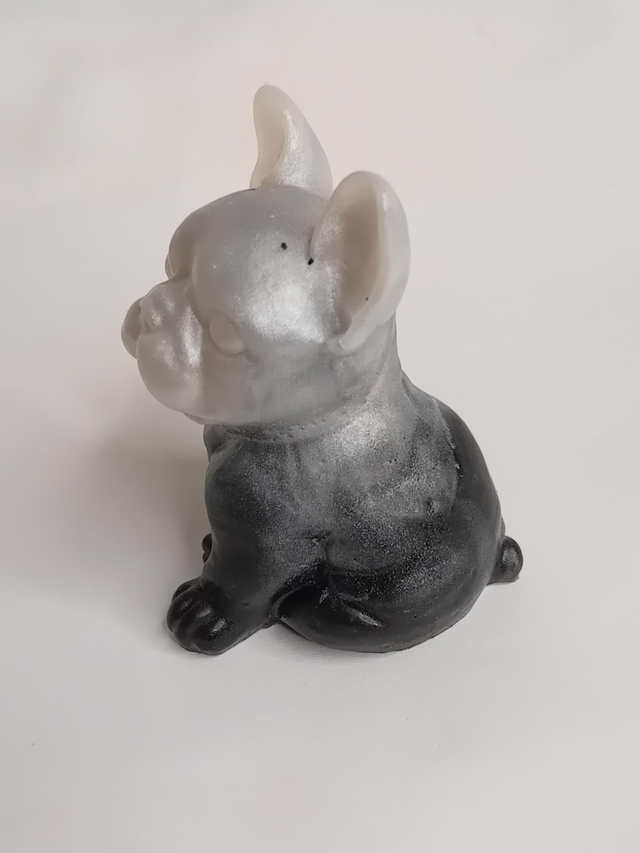 Petit chien assis noir et blanc nacré