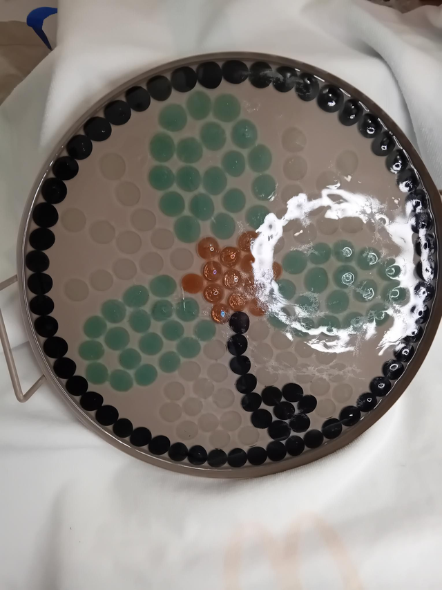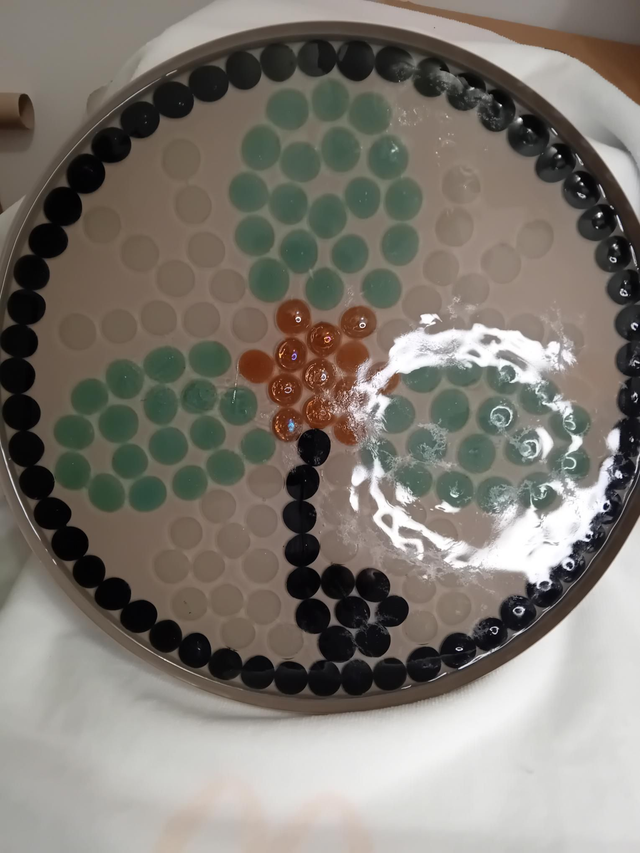 Plateau en aluminium avec bille de verre incrusté forme fleur recouvert de résine
