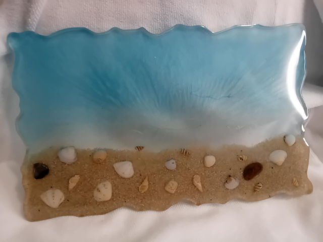 Plateau sans manche thème plage avec incrustation de sable et de coquillages