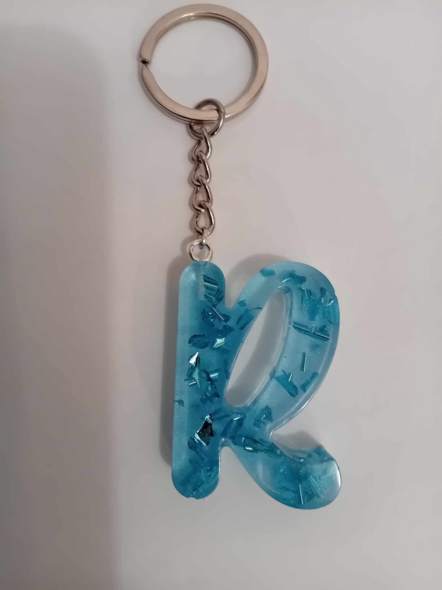 porte clef lettre R bleu ciel avec feuilles pailletés bleu turquoise