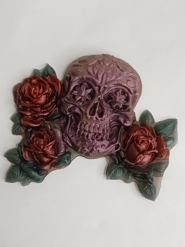 Skull nacré avec rose rouge et feuilles vertes